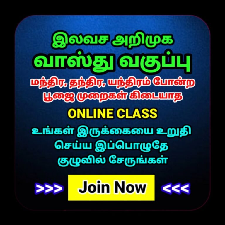 வாஸ்து வகுப்பு பற்றிய அறிமுக வகுபின் சிறப்பு அம்சங்கள் : வாழ்த்துக்கள் ! அறிமுக வாஸ்து வகுப்பில் கலந்துகொள்ள முடிவு செய்துள்ளீர்கள் ! * பரிகாரம் என்கிற மந்திர, தந்திர, யந்திரம் போன்ற பூஜை முறைகள் கிடையாது. * வாஸ்துவால் வாழ்க்கையை மாற்ற முடியும் என்பது புரியும். * வாஸ்து பற்றிய ஆச்சர்யமான தகவல்கள் கிடைக்கும். * வாஸ்துவை தொழிலாக செய்பவர்கள் பற்றிய உண்மைகள். * வாஸ்துவை பற்றிய உங்கள் எண்ணங்கள் மாறும். Join WhatsApp Group *** 100 PARTICIPANTS ONLY *** நாம் இலவச அறிமுக வாஸ்து வகுப்பில் சந்திப்போம் மேலும் விபரங்களுக்கு : 9962077035